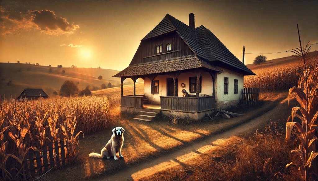 Ultima casă de pe strada din localitatea undeocuiește nea Petre, de aici începe lanul de porumb.Casa cu prispă, acoperită cu carton asfalt – pealocuri rupt,
